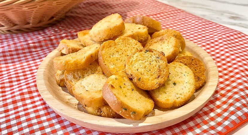 麵包餅乾搭配上濃郁的香蒜奶油,香脆好吃,可搭配沙拉與濃湯一同享用。