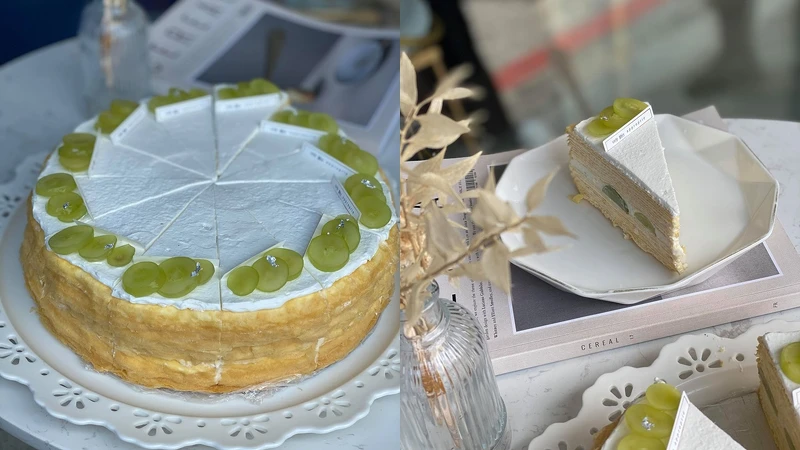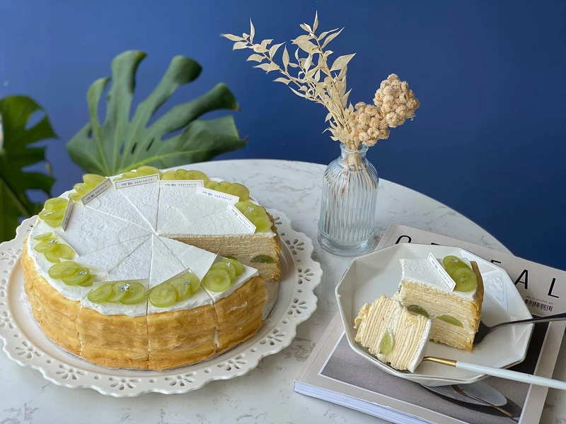 另一款夢幻口味則是「麝香葡萄千層蛋糕」,無籽又飽滿多汁的麝香葡萄,配上使用白乳酪加上貴腐酒的特製內餡,翠綠的麝香葡萄宛如寶石般鑲在其中,吃起來清爽又不膩口,是本季不能錯過的幸福甜品。