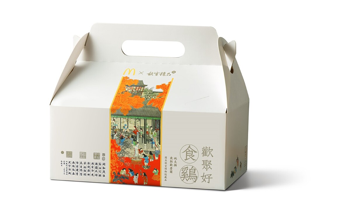 這次麥當勞 X 故宮精品打造期間限定麥當勞分享盒「歡聚好食鷄」限定包裝,採用清代將團圓和樂、國泰民安表現淋漓盡致的姚文瀚《歲朝歡慶圖》,多了點趣味和古典風情。