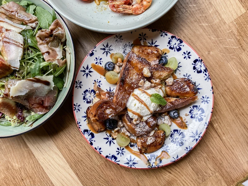 手工揉製法國傳統麵包布里歐,出爐後抹上奶油及砂糖,用鐵鍋煎烤至邊緣出現金黃色的焦糖脆皮,搭配無花果、酸甜莓果,和濃郁的香緹鮮奶油,酥、嫩、濕、軟四種口感交融,是一餐中最美好的ending!