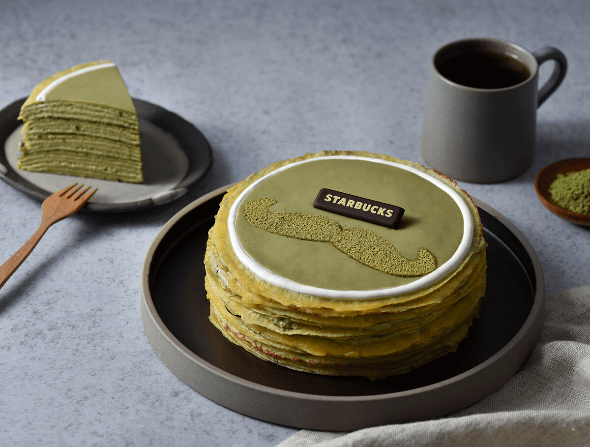 表層造型放上代表爸爸鬍子的裝飾,選用日本抹茶粉製作而成,特別增量抹茶奶油的份量,在層層堆疊的抹茶薄餅上,感受更濃郁綿密的口感與抹茶風味。