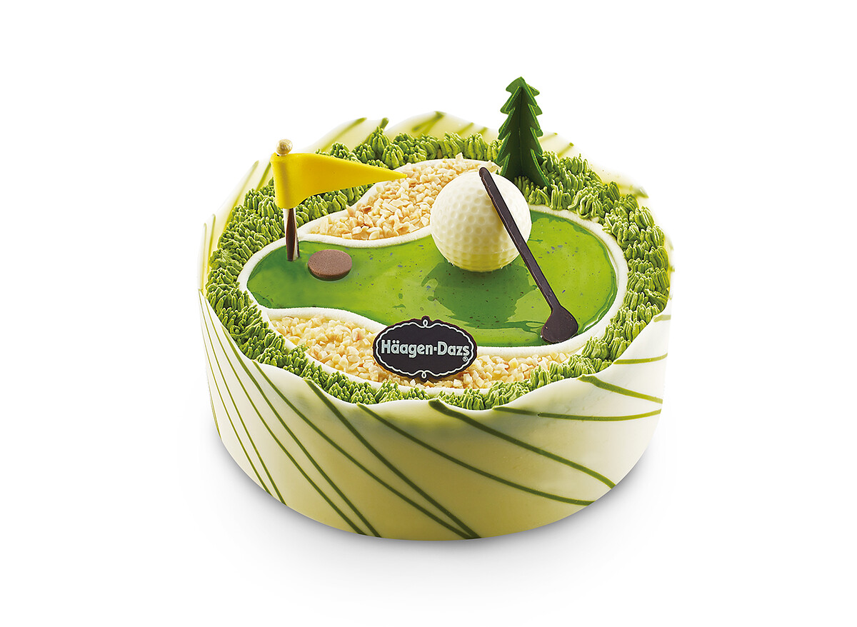 以抹茶、夏威夷果仁冰淇淋設計成高爾夫球場造型,讓球桿下的小白球在果嶺上漫遊,等待一桿進洞的歡慶時刻,蛋糕由顆粒飽滿的夏威夷果仁,加上芳醇濃郁的抹茶冰淇淋,創意造型加上豐富的口感層次,滿足能上山下海,任何戶外運動都難不倒的運動健將老爸。