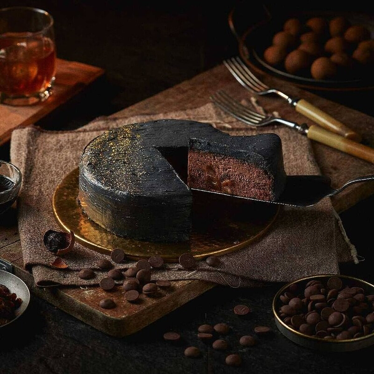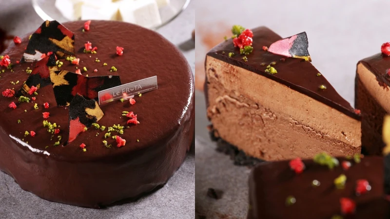 巧克力蛋糕蓬鬆柔軟、濕潤可口,搭配蛋糕表面清爽的奶霜與巧克力碎片,夾層中的酒漬碎櫻桃奶油餡為整體的蛋糕帶來畫龍點睛的亮點。