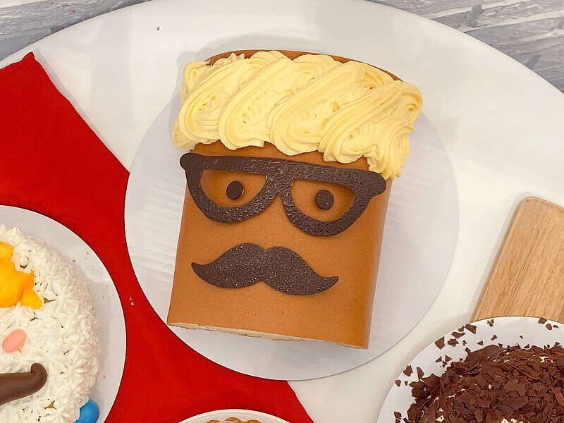 內餡融合咖啡與卡士達鮮奶油,並刻意降低甜度,表現出咖啡迷人的香醇苦韻,吃起來不會太甜膩。另外在蛋糕最上層淋上咖啡風味的巧克力鏡面,以及法芙娜可可碎片做成鬍子造型點綴,為味蕾帶來完美的苦甜平衡之餘,視覺上也相當俏皮。