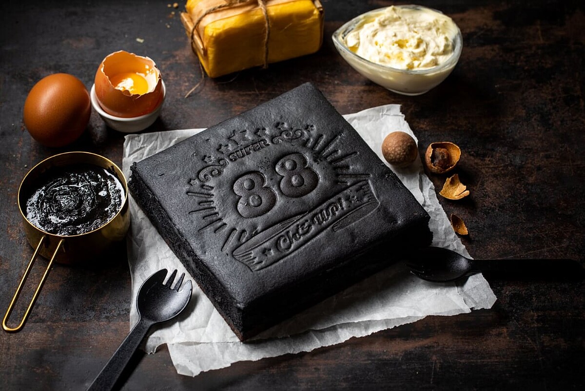 招牌的美式起司蛋糕大方調入以柴火特別焙炒激發香氣的屏東金弘純芝麻醬、超厚工的流淚級美味台南東山窯烤龍眼乾,再以些微天然竹炭粉調色,外表呈現沉穩大器的曜黑質感,入口濃郁綿滑的芝麻奶香逐漸擴散,龍眼乾Q彈帶有煙燻甘香,復古美味讓人意猶未盡!