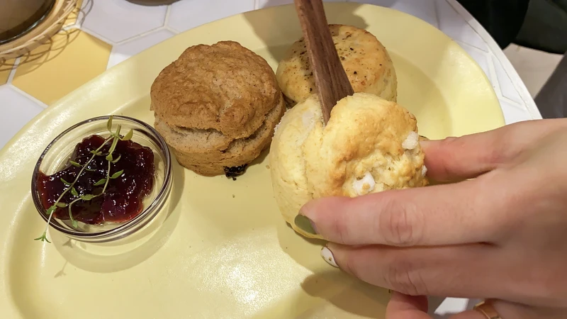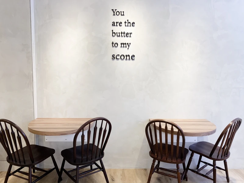 其中還有不少打卡景點,像是店門口超可愛的黃色司康牆面,而內用座位區的牆面上還有著一句非常浪漫的話:「You are the butter to my scone」改編於電影美味關係,你就像我司康上的奶油,是我生命中不可或缺的人!