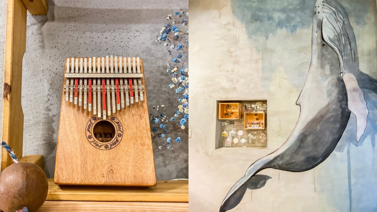 牆面上繪製著一隻巨大的鯨魚,這幅畫也出自於老闆的巧手,在每個角落也能發現不同樂器的身影,像是卡林巴琴(拇指琴)、阿沙拉托…等等,讓人能夠放下工作壓力、厭世感,好好感受來自蘇澳的慢活生活!