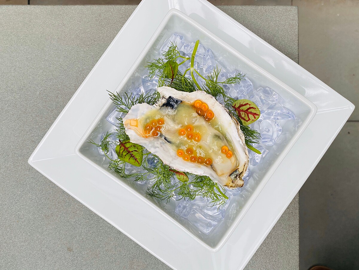 情人節套餐的序幕由有海中牛奶之稱的生蠔擔綱,生蠔略為水煮後拌入香料調味,襯在蛤蜊絲瓜凍上,一同冷藏後端出鮮味十足的開胃冷盤。