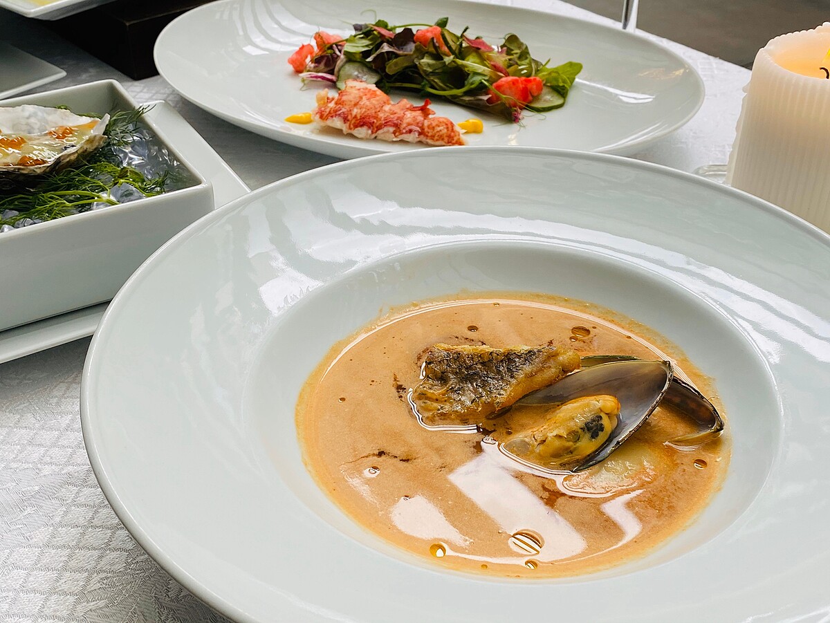 湯底以龍蝦頭、整尾白蝦,以及西洋芹、紅蘿蔔、番茄等大量蔬菜熬煮,撒上輕烘焙的松子用以增加口感,最後擺上馬祖淡菜與新鮮鱸魚菲力而成。