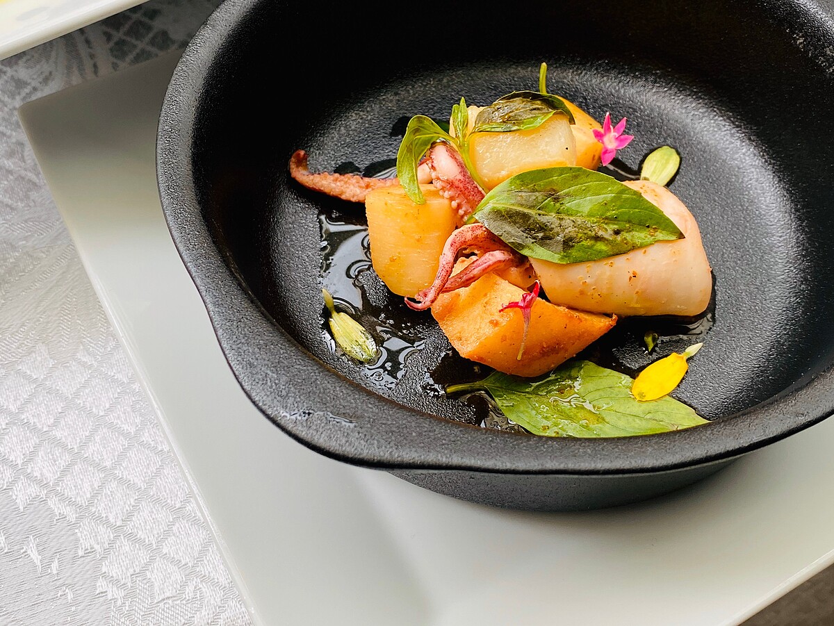 以花椒爆炒新鮮干貝與透抽,並拌入當季綠竹筍,充滿川式麻辣風味,主廚以此詮釋情人間的另一熱情風韻!