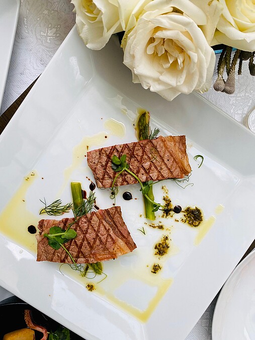 主廚掌握火侯煎烤出香嫩多汁的宜蘭櫻桃鴨胸肉,搭配咖啡酒入味的核桃與紅酒醬汁,畫龍點睛的提味讓人印象深刻。