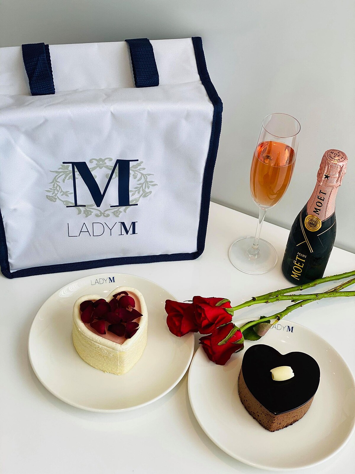 愛心玫瑰千層蛋糕*1+愛心皇冠巧克力蛋糕*1 + Moët Brut香檳 200ml*1+牛津布保冷袋*1+愛心蠟燭*1