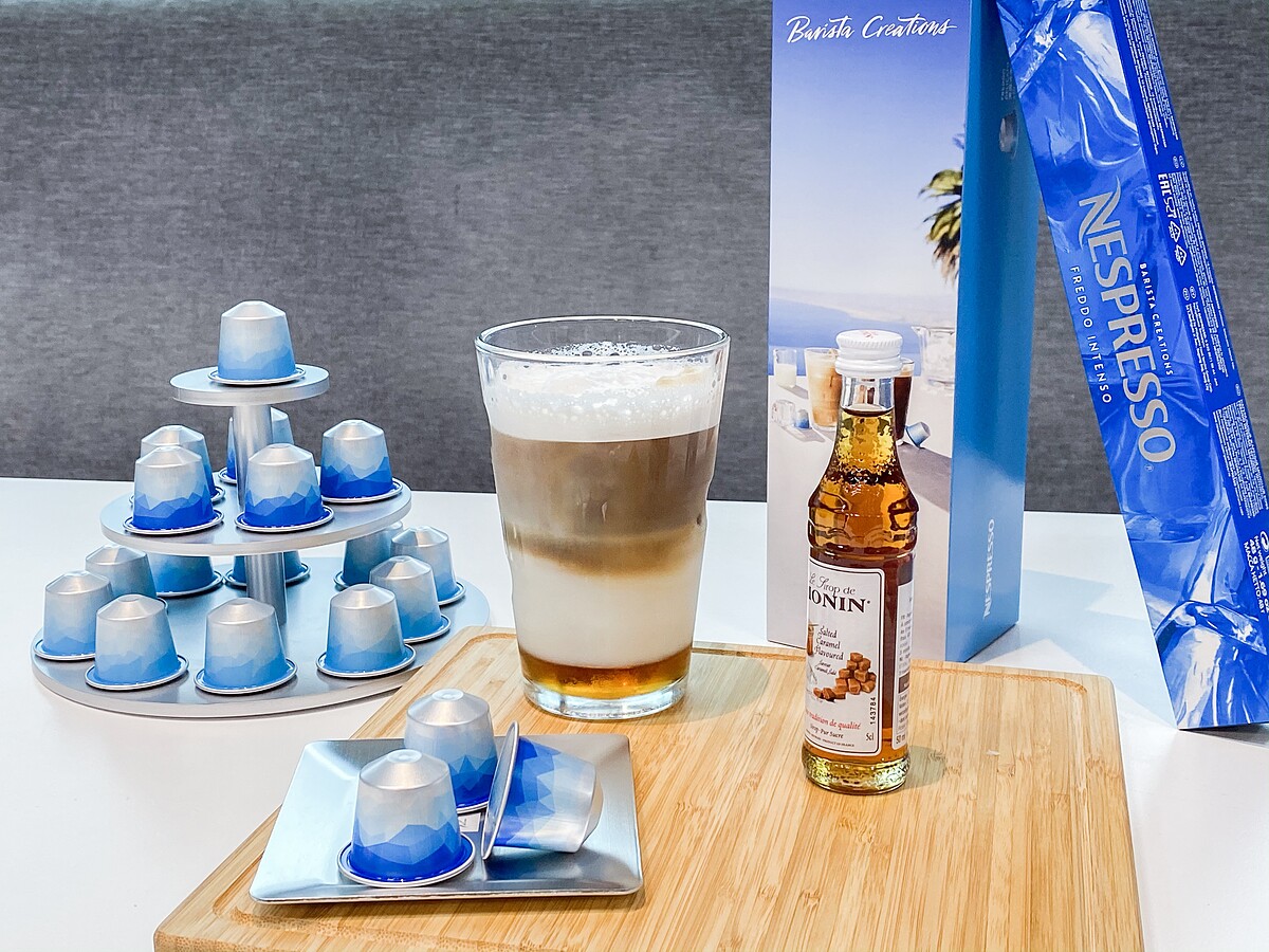 以濃醇冰咖啡膠囊、海鹽焦糖風味糖漿及冰牛奶打造的香醇咖啡特調,帶有層次豐富的烘烤穀物與木質香調,再加入海鹽焦糖風味糖漿,享受甜蜜滋味中帶有微鹹的口感,並搭配香醇冰奶泡感受濃郁的美妙滋味。