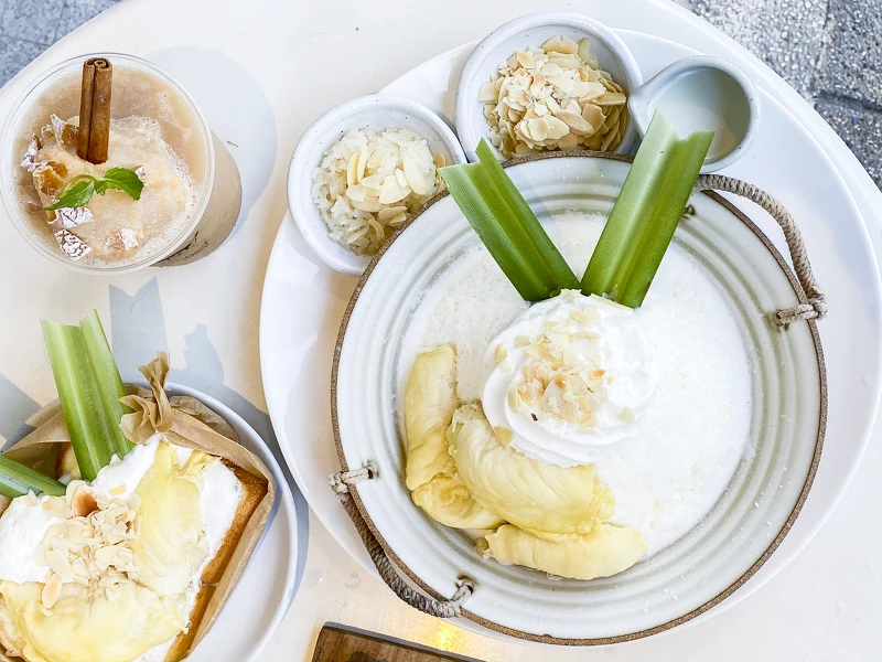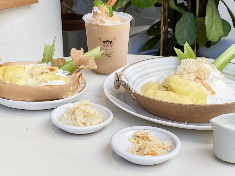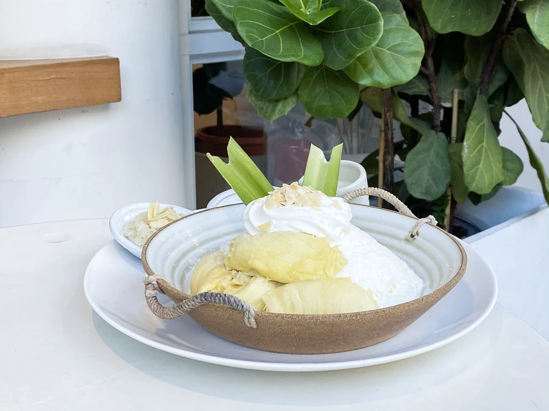 也可以佐以店家特製的醬汁,使用椰奶、榴槤、斑蘭葉熬煮而成,也可以搭配椰奶糯米一同享用,口感豐富多層次!
