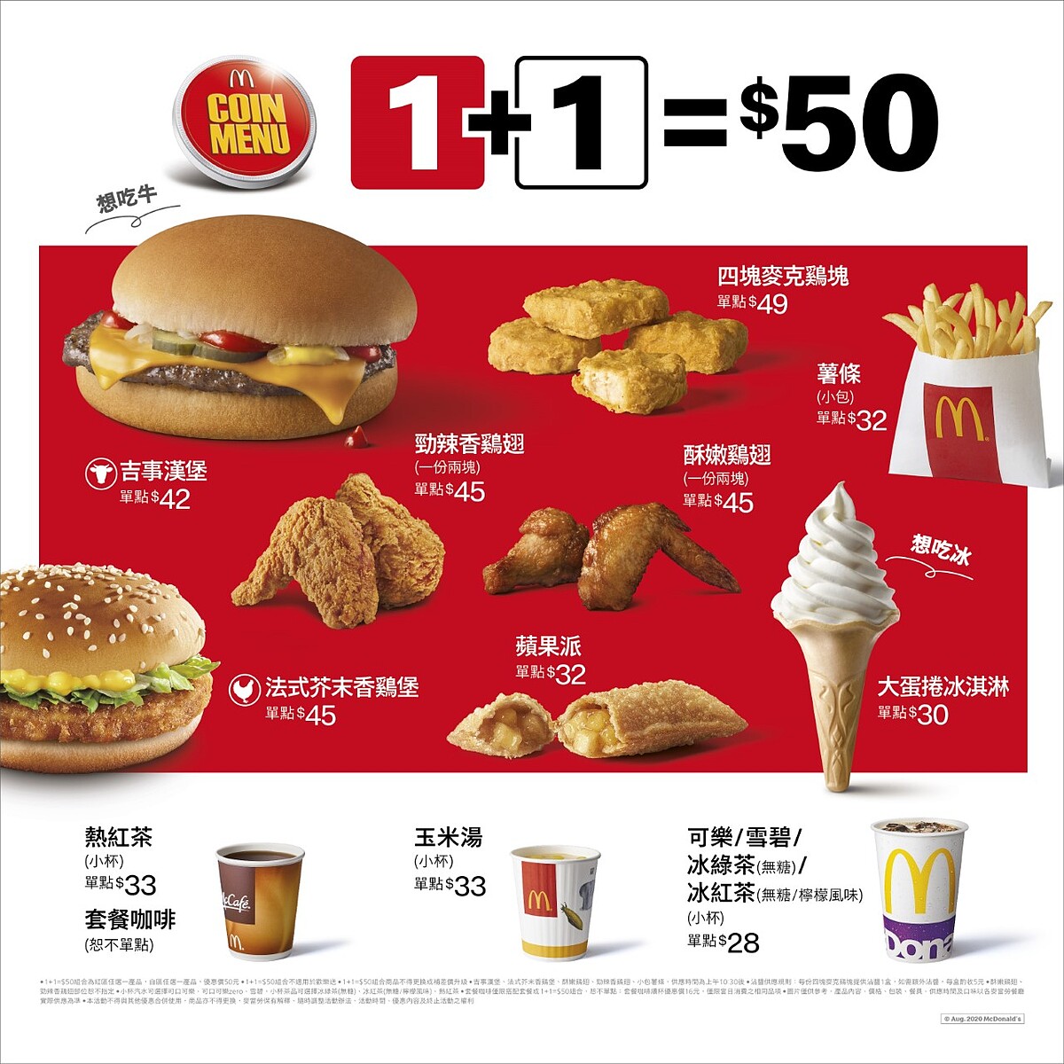 此外,新增的菜單內容,則是「煙燻鷄肉長堡」、「薑燒豬肉長堡」正式進駐「超值全餐」主餐行列,「1+1=$50銅板輕鬆點」紅區則增加「吉事漢堡」、「大蛋捲冰淇淋」,只需50元就能享用,還有「McCafé」則加入「蜂蜜紅茶」、「蜂蜜檸檬冰沙」。