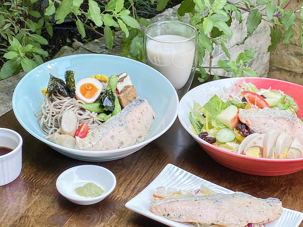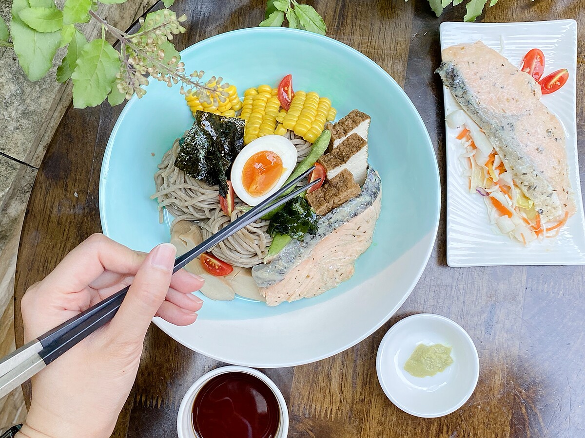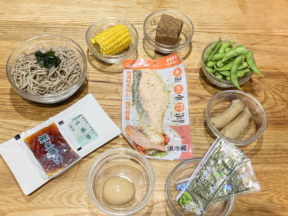 食材(1人份):美威精選鮭魚菲力-義式香草60克、蕎麥麵230克、海苔5片、鹽味毛豆80克、溏心蛋1顆、豆腐100克、杏鮑菇30克、玉米40克
