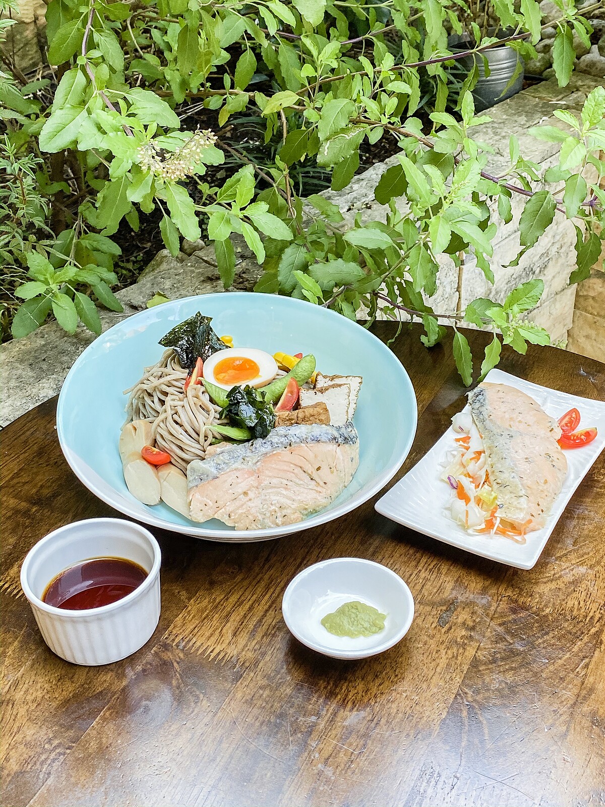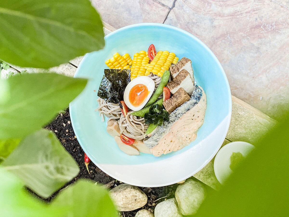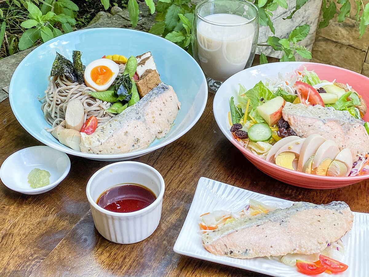食材(1人份):美威精選鮭魚菲力-義式香草60克、蕎麥麵230克、海苔5片、鹽味毛豆80克、溏心蛋1顆、豆腐100克、杏鮑菇30克、玉米40克