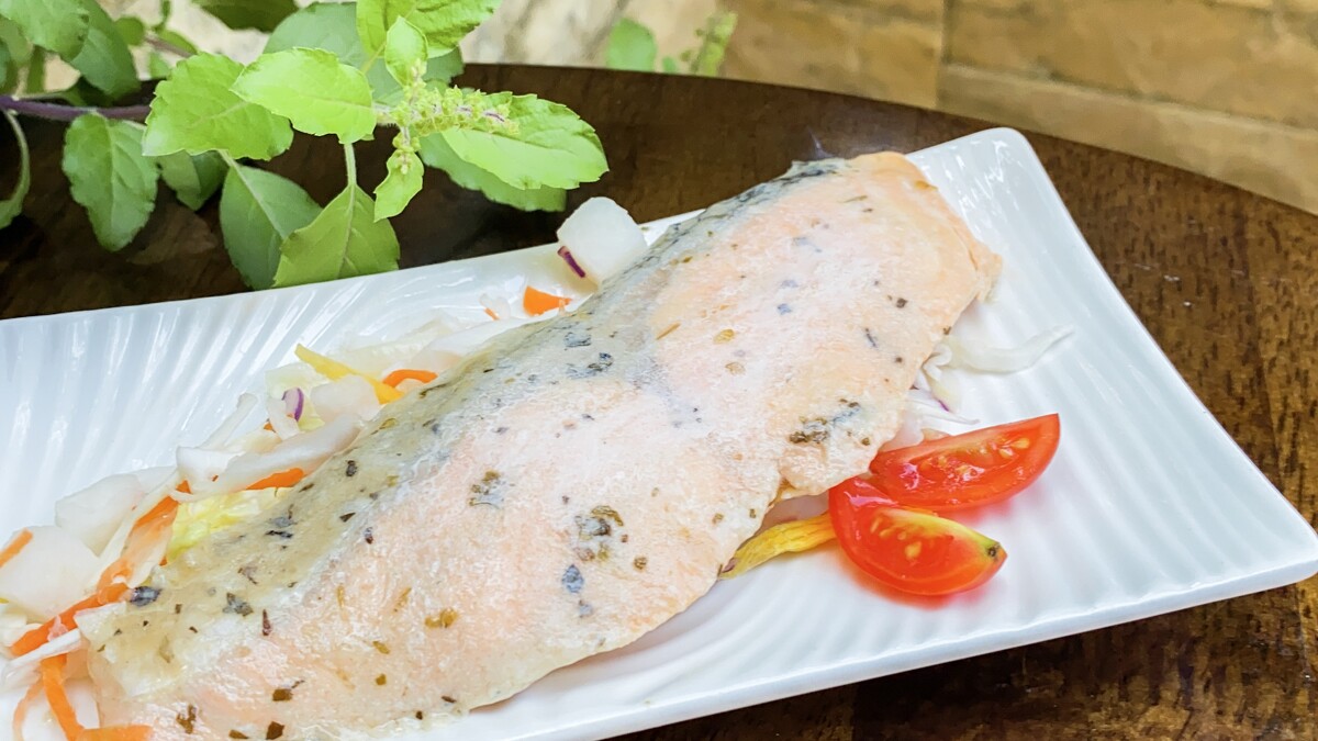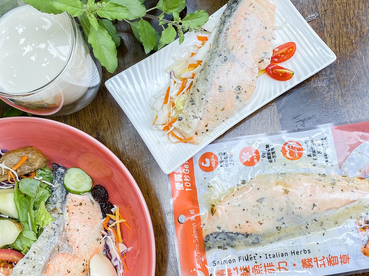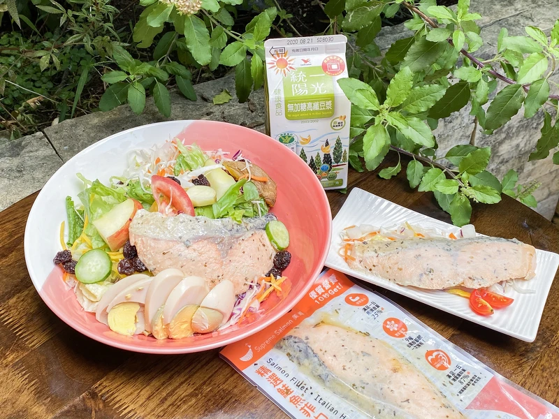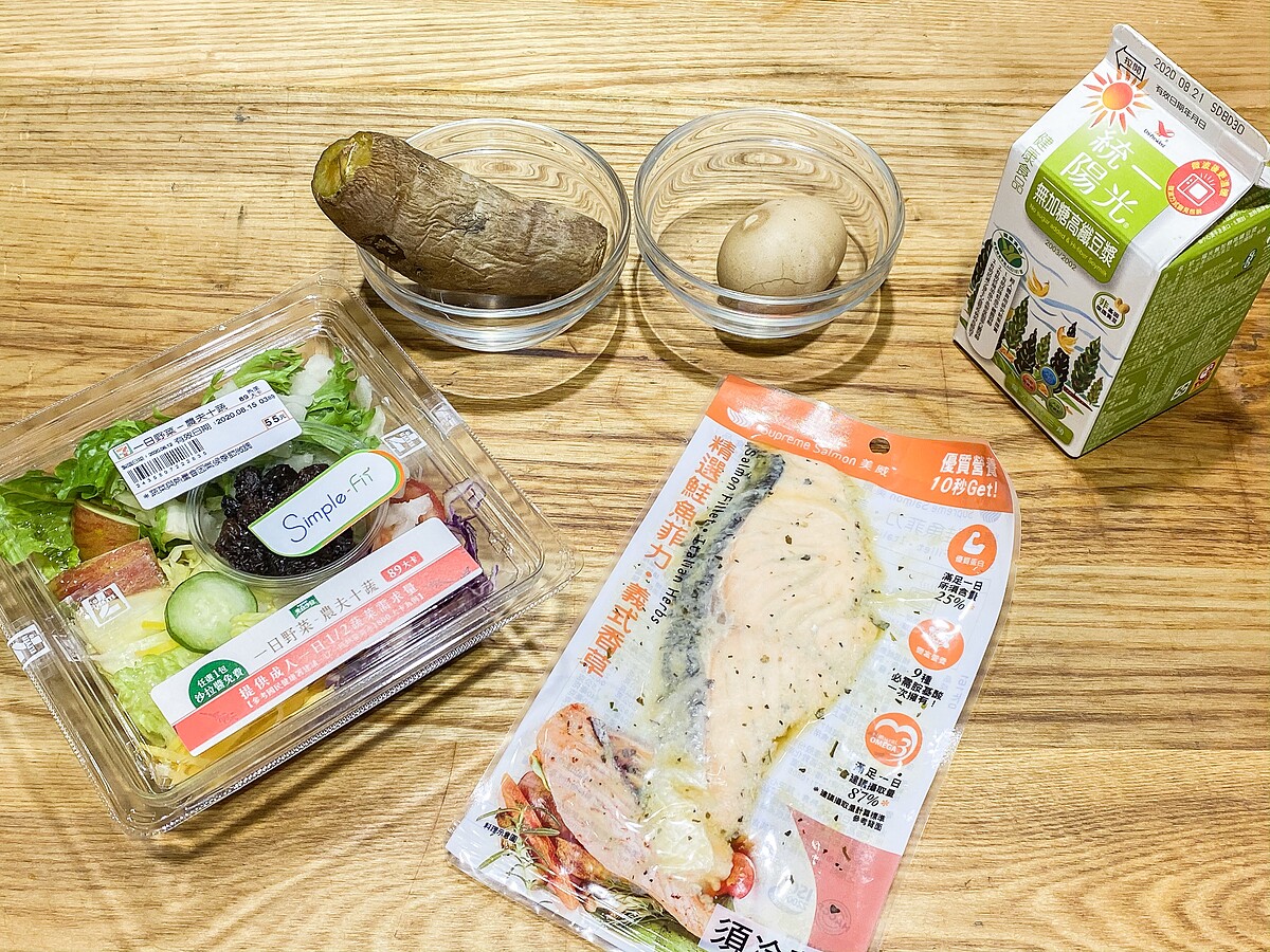 食材(1人份):美威精選鮭魚菲力-義式香草60克、綜合水果沙拉1盒、無糖豆漿1盒、茶葉蛋1顆、葡萄乾20克、地瓜1顆