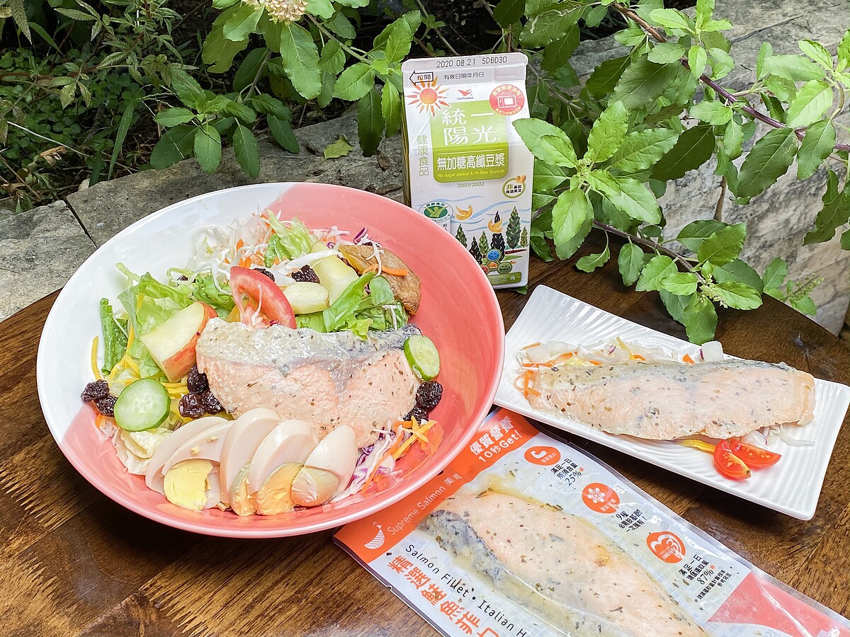 取盤放入綜合水果沙拉、義式香草鮭魚菲力、地瓜、撒上葡萄乾,搭配茶葉蛋與無糖豆漿即食享用。