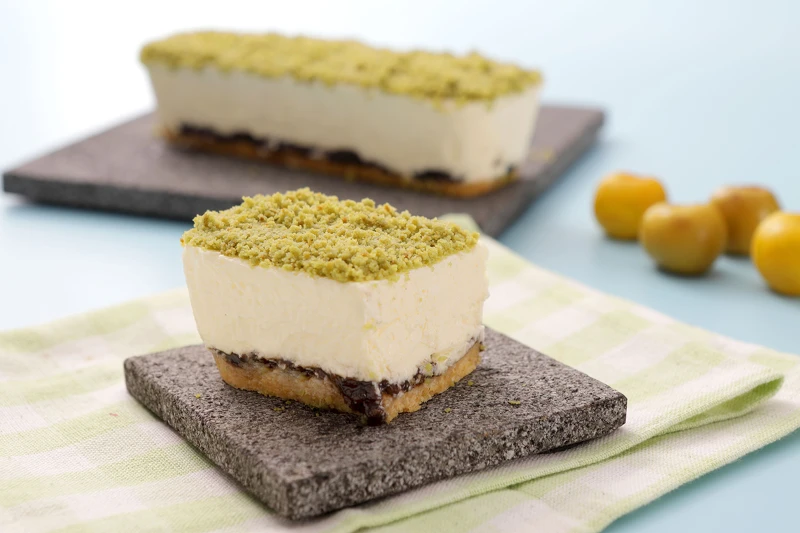 以奶油乳酪製成的空氣感慕斯蛋糕,嚴選用台灣在地的青梅、桃子與李子一起醃製熬煮成微酸甘甜的青梅果醬,襯著底層手工酥餅,外層撒上抹茶雪絨蛋糕粉,青梅酸與乳酪的甜完美交融,酸甜滋味讓人忍不住一口接一口!
