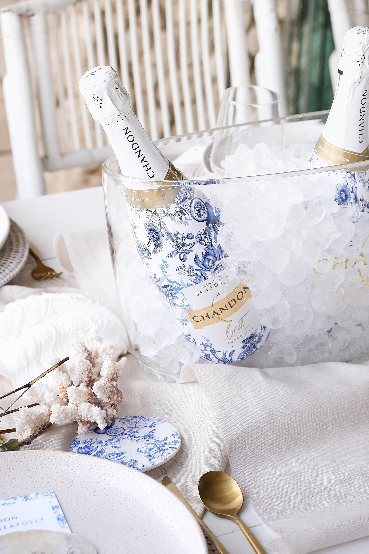 整體以藍白為主色調,除了以各大海灘經典地標做出區別,也細膩靈巧地結合熱帶水果與當季花卉圖騰,讓氣泡酒瞬間變成藝術品般的優雅迷人。