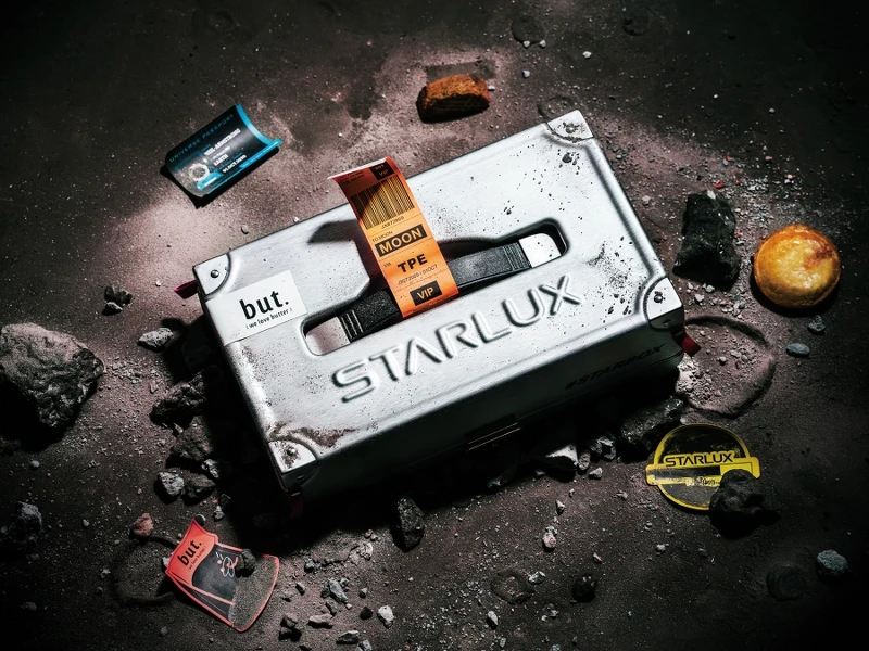 2020年初開航的星宇航空STARLUX Airlines,迎來第一個中秋節,與but. we love butter奶油甜點聯手推出的中秋禮盒,將用來裝載行李與貨物的「航空集裝箱AKH貨櫃」縮小為外型、防掛耐摔的行李箱主流材質ABS+PC製作,上面更有髮絲紋,配上銀色外型超有未來風格。