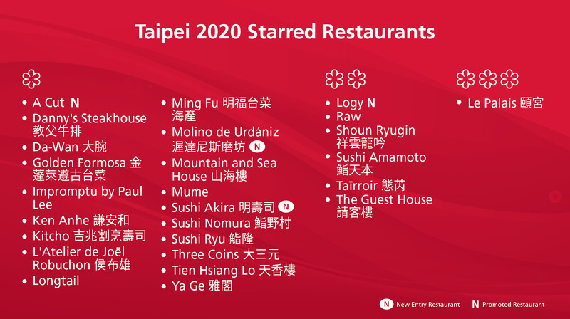 新出爐的台北米其林餐廳指南中,共有4間餐廳獲得星級肯定,其中目前台灣唯一一家三星餐廳的高人氣「頤宮」中餐廳,這回三連霸勇奪米其林三星,晉升二星的則是主打義法歐式料理的「logy」,老字號牛排「A Cut」今年由餐盤推薦晉升為一星,而新入選一星的餐廳分別有「渥達尼斯磨坊(Molino de Urdániz)」以及「明壽司(Sushi Akira)」。