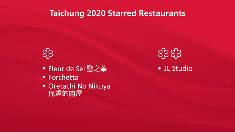 台中部分同樣也有4間餐廳獲得星級肯定,由新加坡大廚林恬耀(Jimmy Lim)領軍的「 JL Studio」獲得二星,拿下一星的則有三間餐廳,包括法式餐廳「鹽之華(Fleur de Sel)」、位於台中七期的時尚歐陸菜名店「Forchetta」,以及專賣和牛的燒烤餐廳「俺達的肉屋」(Oretachi No Nikuya)。