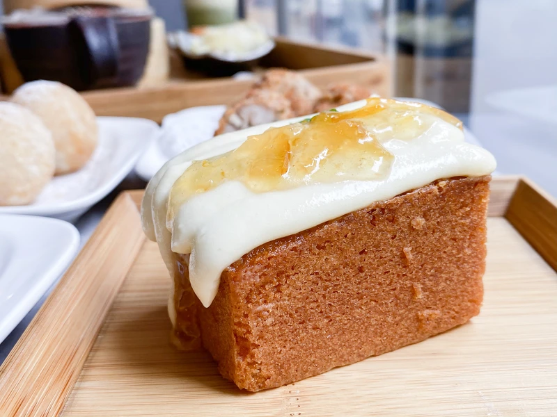 與市售的常溫磅蛋糕最大的不同是店內販售的是濕潤好入口的熱磅蛋糕,而這款甜點以柚子為主軸,磅蛋糕的基底是柚子風味,上方放上鮮奶油搭配柚子醬,濃濃的中秋風味悄然而至!