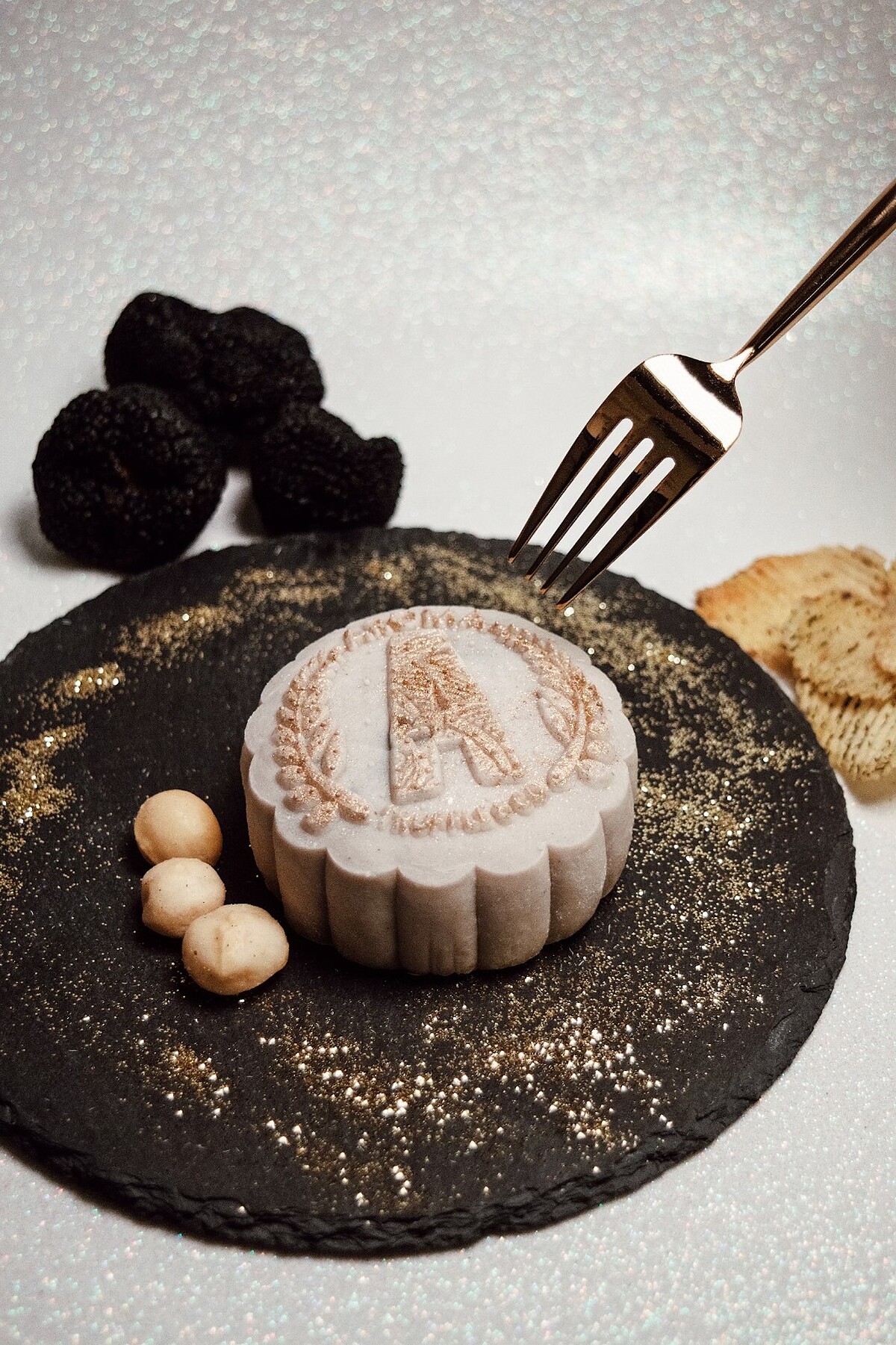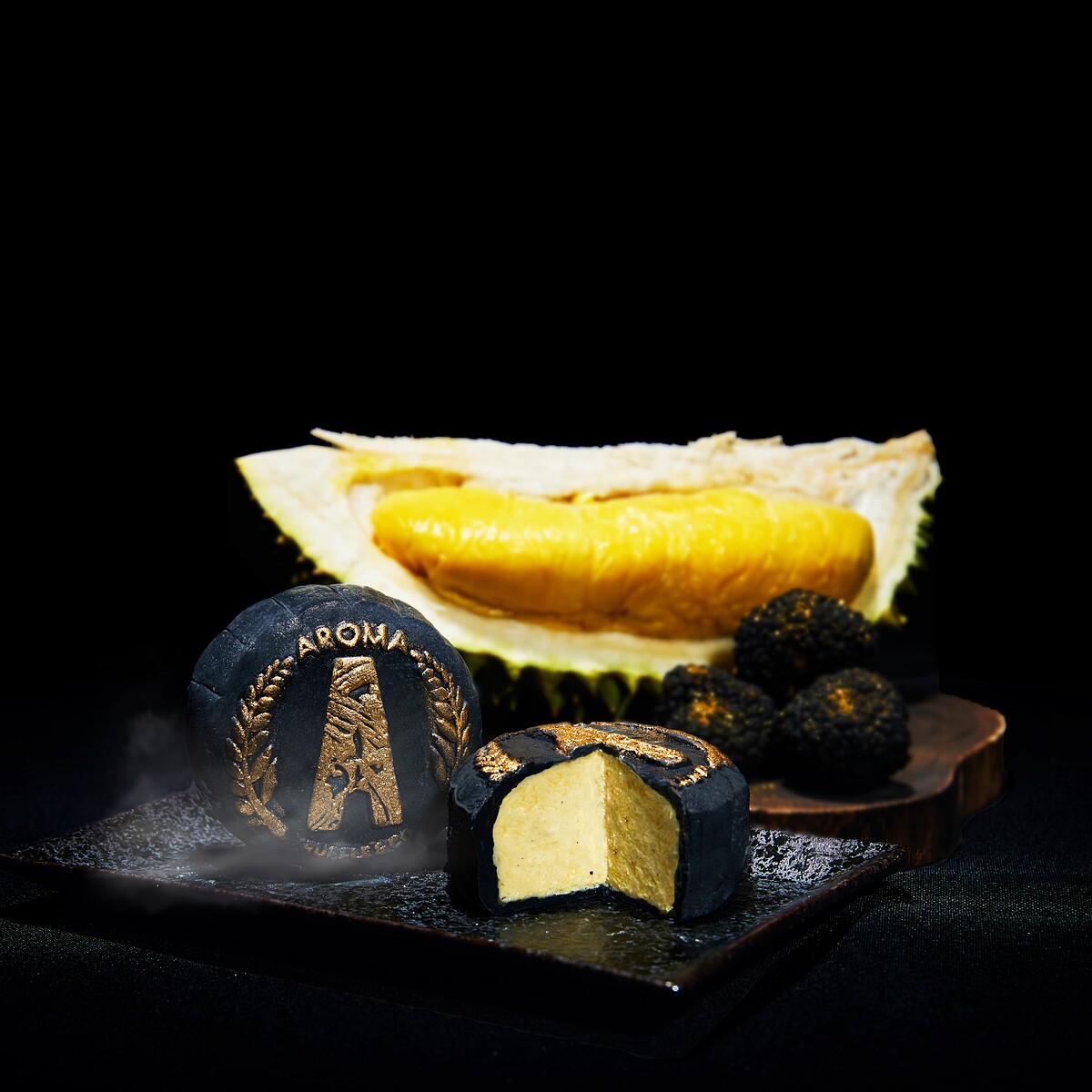 其中一款是「黑松露貓山王榴槤冰皮月餅」,將黑色義大利松露搭上100%嚴選出產於馬來西亞彭亨州的貓山王榴槤肉,外層用手工竹炭冰皮包裹,接著撒上可食用的金箔,光是外型就有著高貴黑金配色,內餡則是香氣撲鼻的榴槤滋味,肯定是榴槤愛好者的新歡。