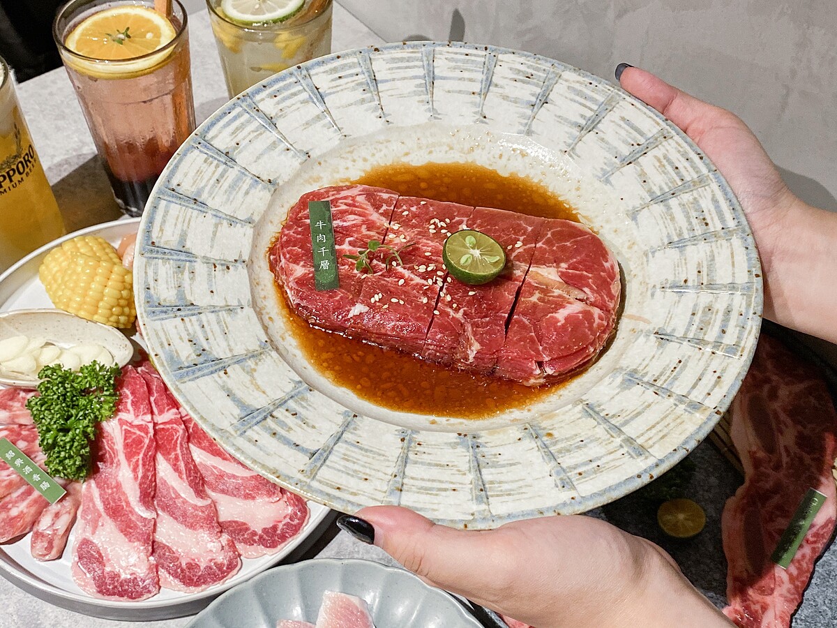 除了超美味的和牛外,最讓人驚艷的就是獨創的牛肉千層,取自板腱最精華的頭段,以細膩刀工切至透光薄度後層層疊起,燒烤上下兩面讓千層邊緣烤至微焦!