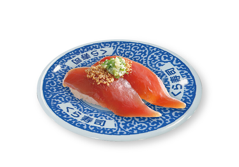 經過藏壽司特調醬汁醃漬過的鮪魚,鮮美更能封鎖在魚肉當中,加上二度焙煎胡麻做點綴,使魚肉的香氣與甘美倍增!