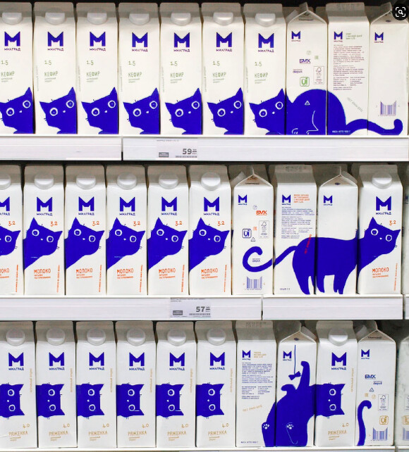 藍色貓咪牛奶罐在網路引起熱議,由俄羅斯的乳製品品牌Милград (Milgrad)近期推出的全新包裝,以貓咪為發想,在純白的紙盒上繪製出一隻超可愛的藍貓!