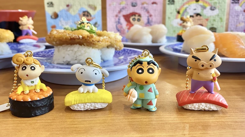 不論是穿著睡衣抱著鮮蝦壽司的小新、還是威風凜凜站在熟成鮪魚上的肥嘟嘟左衛門、坐在大粒鮭魚卵軍艦上的呆萌小葵、或是趴在玉子燒壽司上軟綿綿的小白,都化身成了最動感的藏壽司扭蛋!
