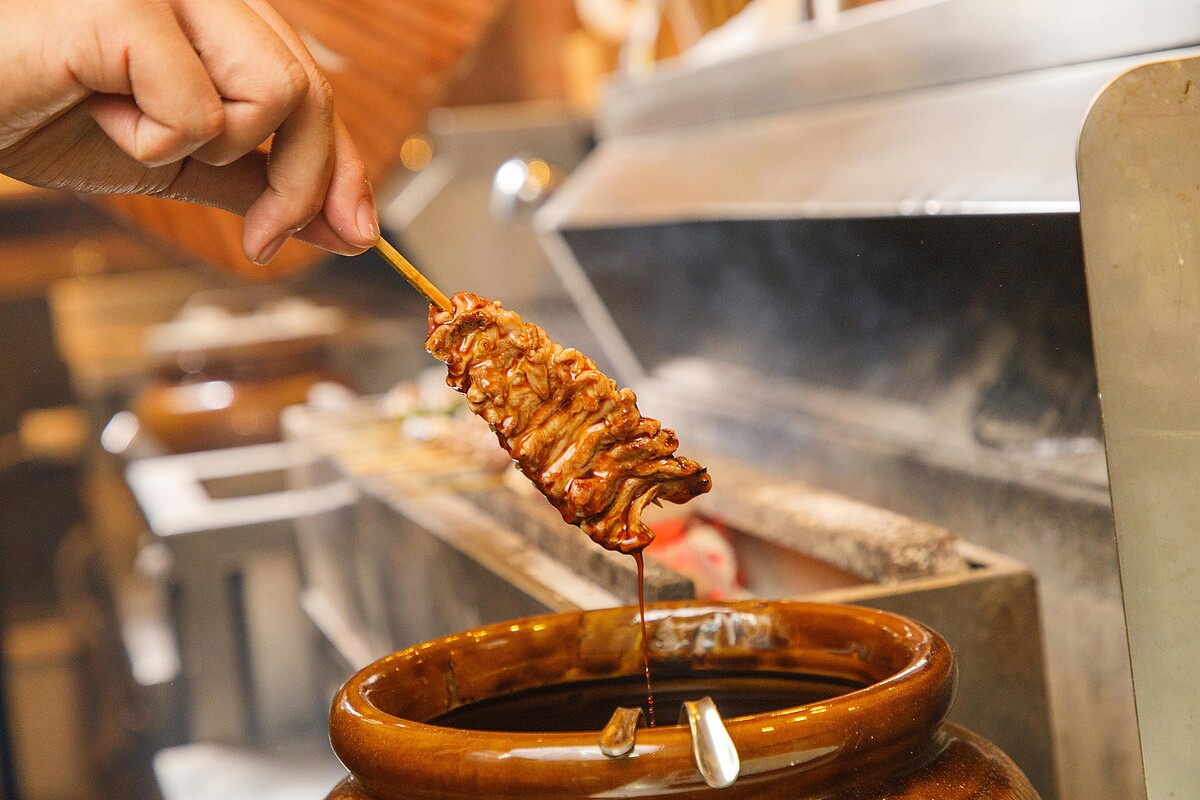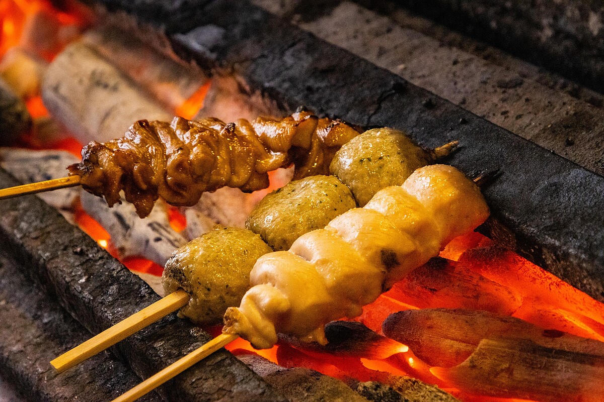 串烤時使用備長碳與手持紙扇特色,藉由備長碳擁有遠紅外線的高溫穿透力來使食材完整受熱,碳烤過程中也不斷以紙扇來調整火侯,減少明火接觸食材,也能降低油脂滴落木炭產生白煙影響風味,讓肉質維持飽滿多汁!