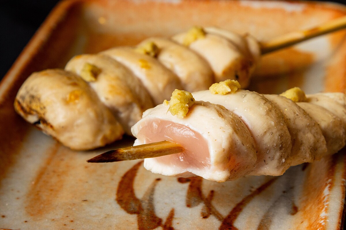 顛覆大家對於雞肉的想像,經典招牌以半熟享用的「山葵里肌」展現對雞肉品質的自信,外觀烤熟的白肉搭配內層帶有生度的透明粉紅色澤!入口感受芥末的香氣刺激味蕾,與雞肉的扎實軟嫩口感,細緻鮮甜迴盪在口中。