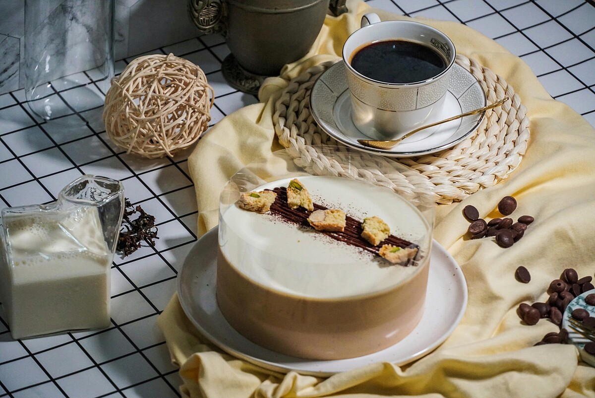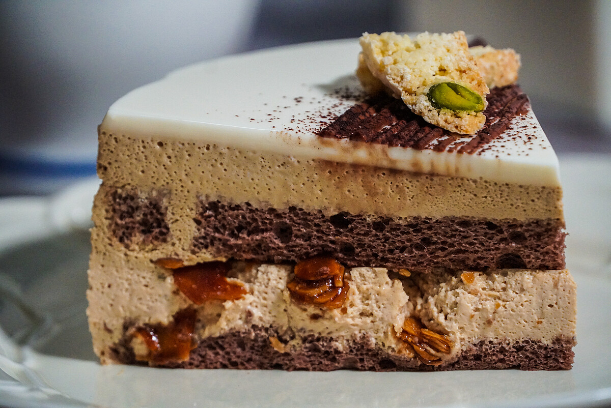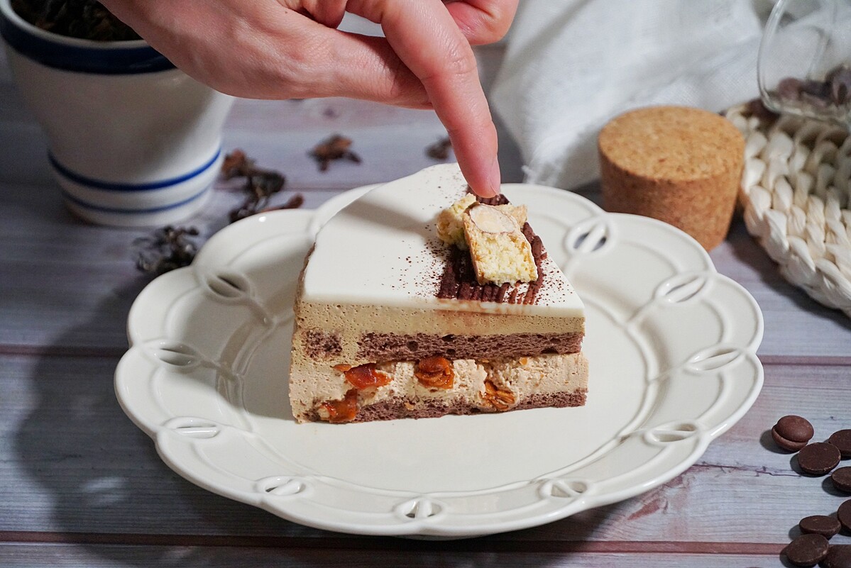 一層為日本炭火焙煎咖啡製成,一層則是英式奶茶口味,為了增加口感,中間夾層增添焦糖杏仁脆片,上方再以香純牛奶凍淋面,以奶香融合兩種慕斯,最後以開心果杏仁餅做裝飾,升級創意版鴛鴦奶茶蛋糕,香醇濃郁的香氣四溢在口中擴散!