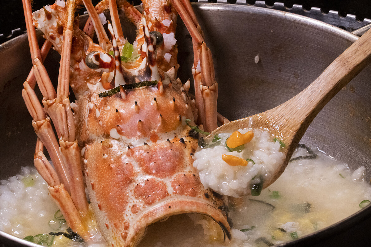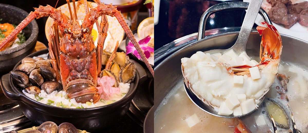 老饕們本季必嚐「貝里斯加勒比海巨大龍蝦」,可以選擇火烤或是龍蝦火鍋,將會有專人現煮「黃金鮑龍粥」,將昆布高湯與加勒比海龍蝦頭一同熬煮,加入台灣東部產的芋香白米,熬煮至米粒成花散狀,陸續加入九孔鮑魚、東石巨蛤細火煲煮,美味又營養的鮑龍粥上桌,肯定讓人食指大動呀!
