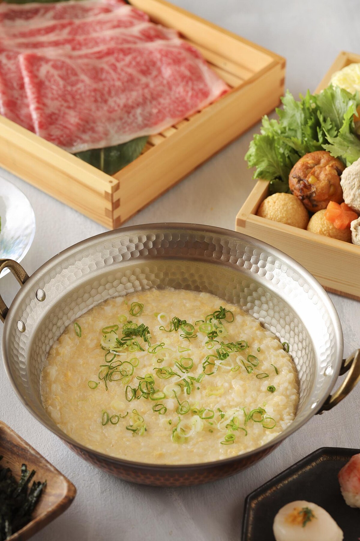 傳統日式涮涮鍋僅以清水煮滾加入昆布熬煮,料理長考量台灣人飲食習慣及口味,以豬大骨加入日本頂級利尻昆布熬煮兩小時,最後以柴魚片提升鮮甜滋味。無論是涮煮肉品及海鮮皆適宜。最後由專人桌邊服務,將越光米飯倒入餘湯中,米粒飽吸食材精華煮成雜炊,香氣四溢。