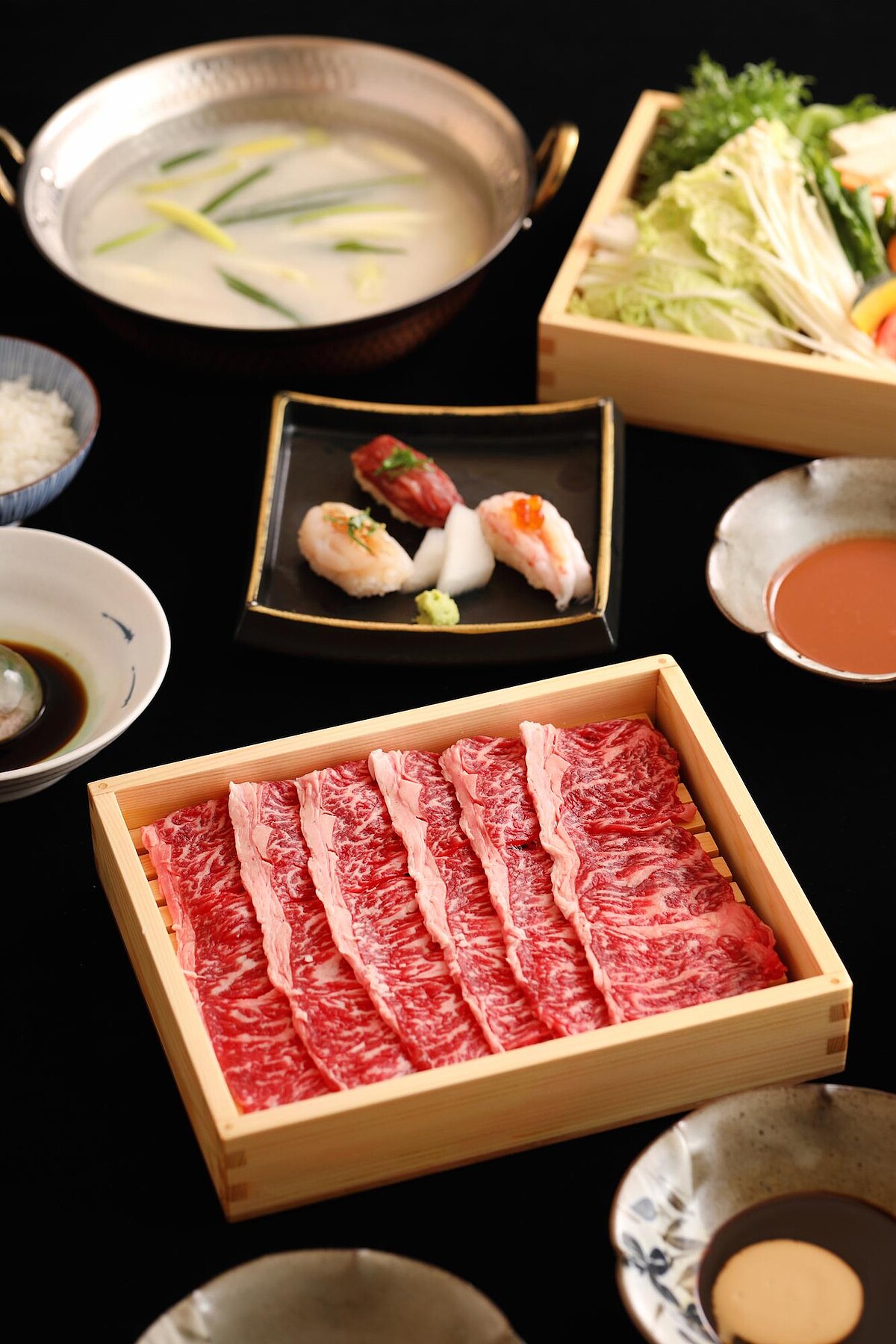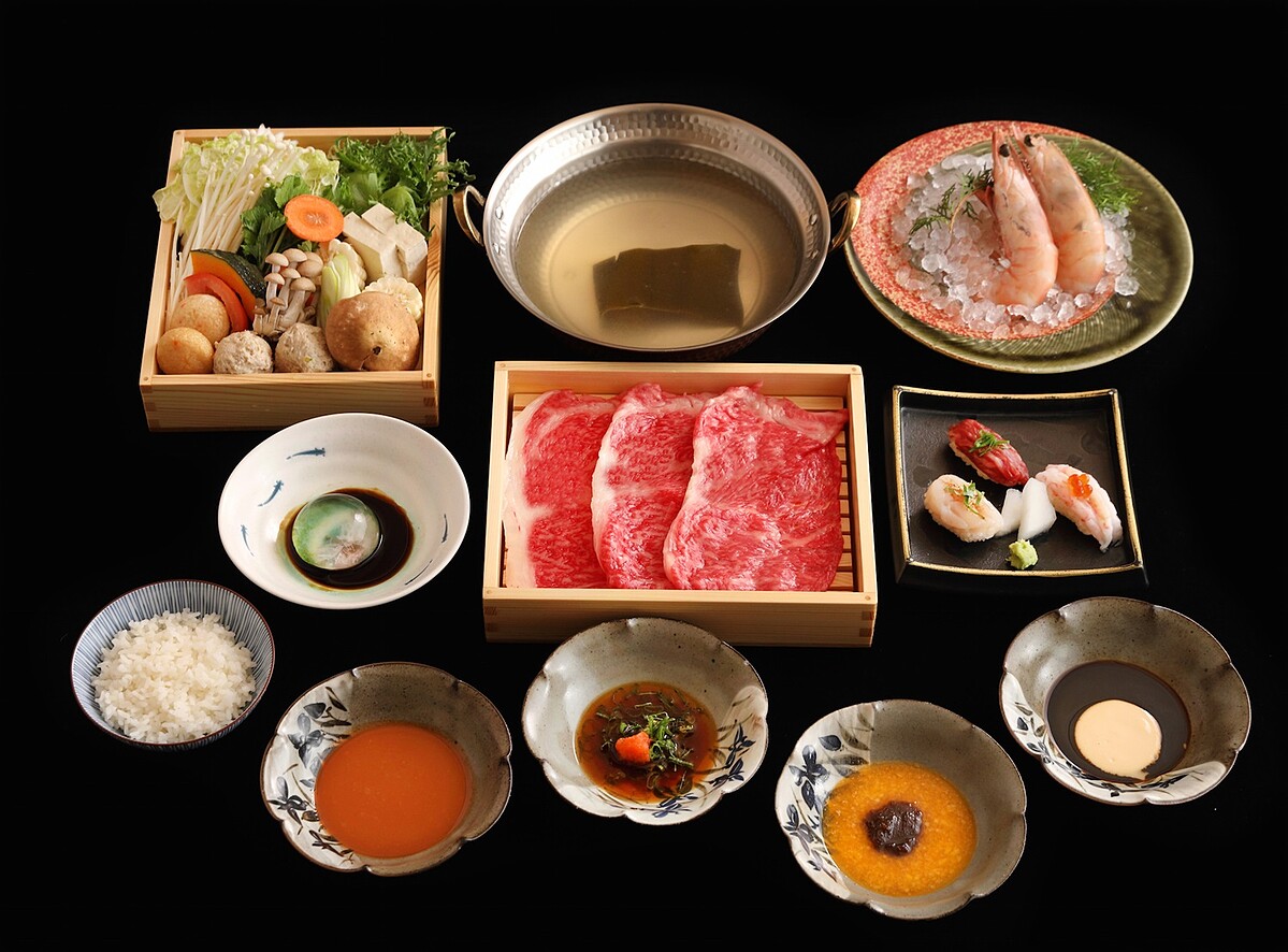 以個人鍋套餐方式供餐, 先肴「握壽司三品」獻上炙燒和牛、干貝、甜蝦三款握壽司,以甘美海味與豐潤和牛開啟食慾。