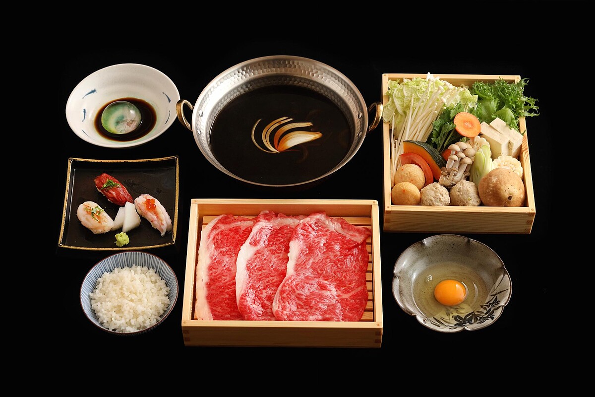 使用和牛油爆香洋蔥,加入醬油、清酒、糖及昆布高湯烹煮成壽喜燒鍋,滋味鹹甜、香氣四溢,煮滾後涮煮牛肉與蔬菜,牛肉吸附甘美壽喜燒醬汁,沾附蛋黃入口,肉質柔嫩甘美。煮過牛肉與蔬菜的濃郁湯汁最後加入蛋液交融,拌炒至滑蛋狀態,覆蓋在越光米飯上,醬香撲鼻、軟嫩金黃的玉子與剔透香Q米飯交融出銷魂完美滋味。