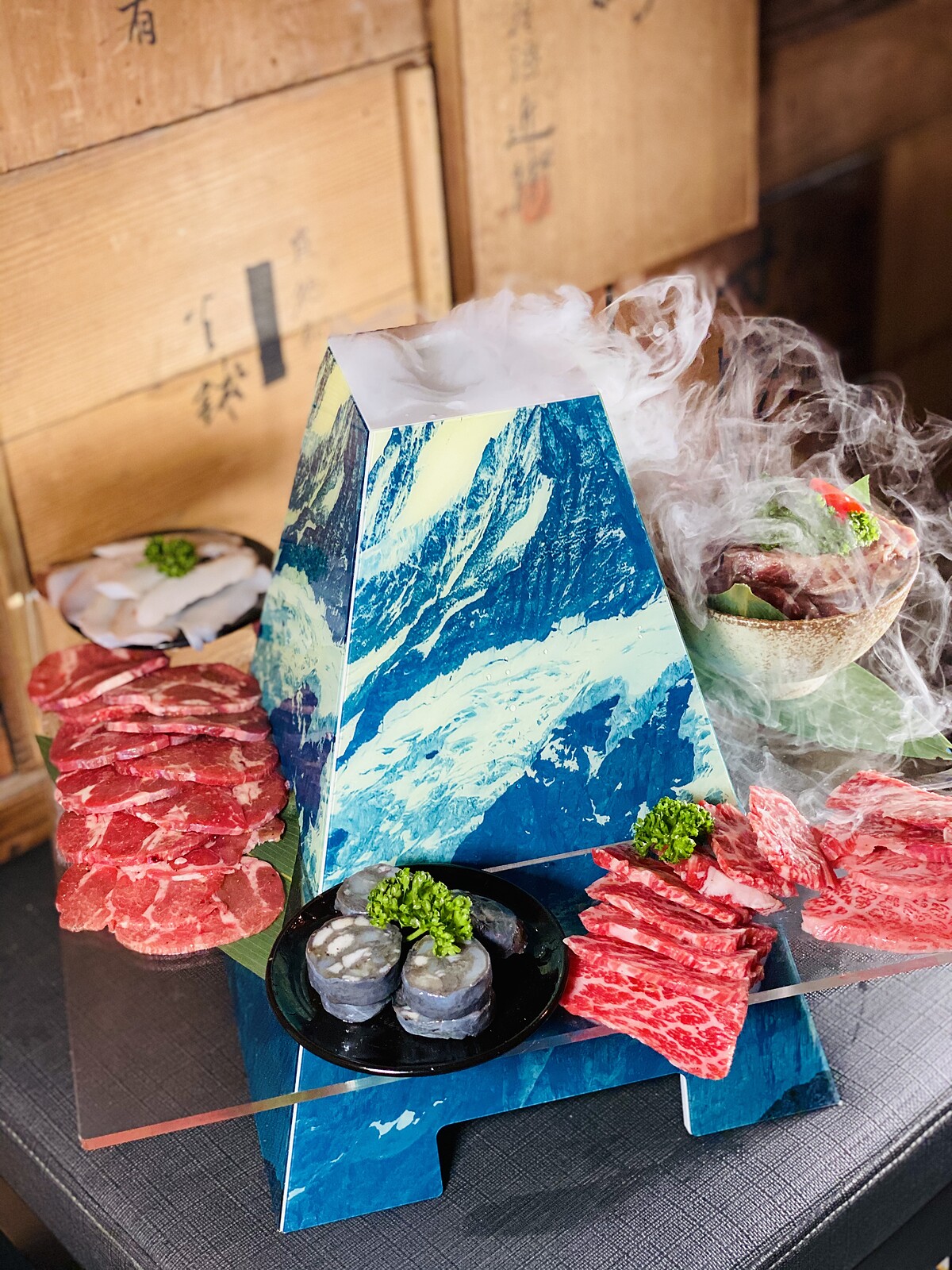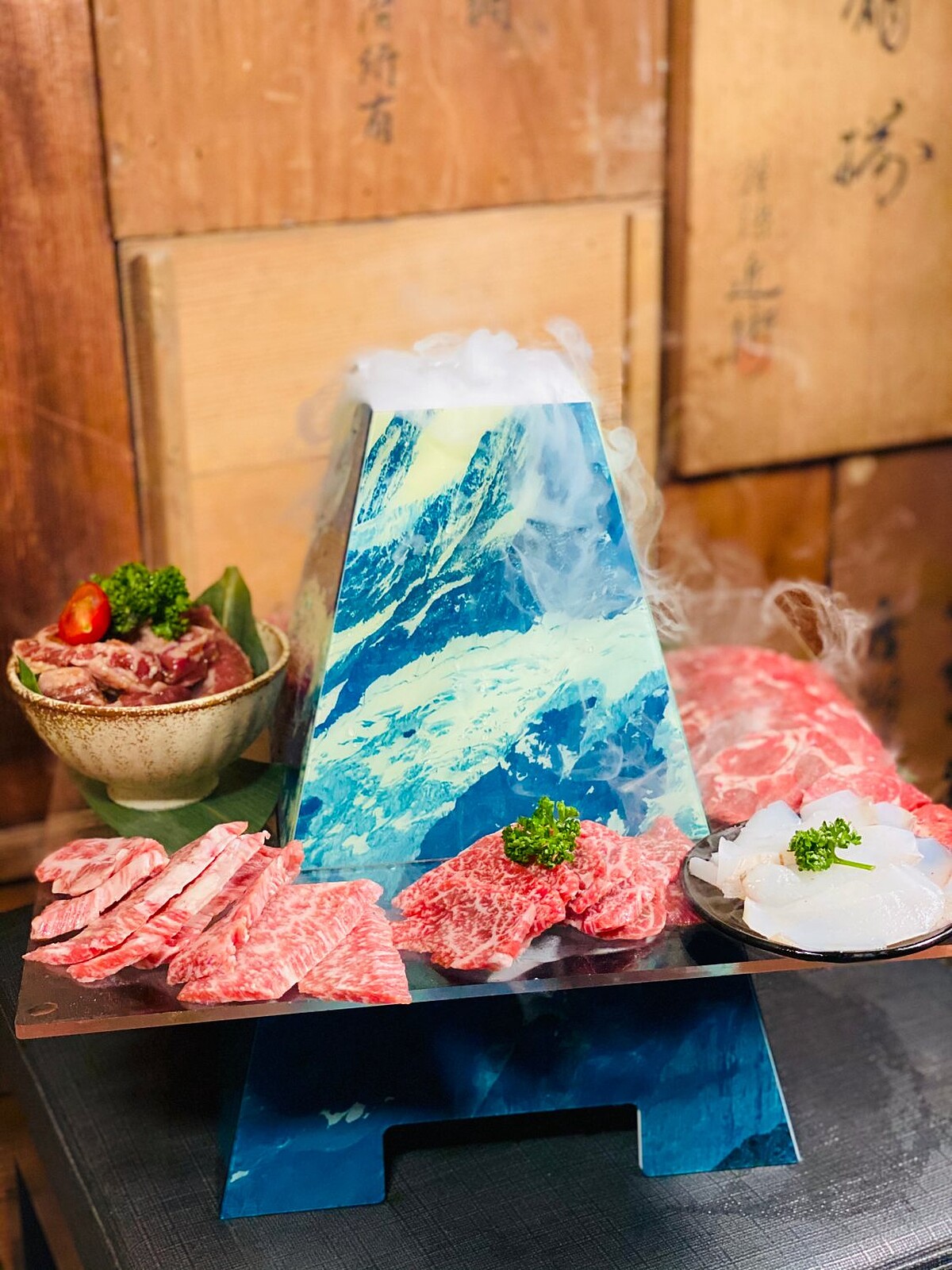 全新推出將原有的燒肉食材加碼升級,富士山造型的容器裡裝載了《胡同燒肉》精選的肋條一條燒、油花細緻且風味突出的胸腹肉、入口即化的A5和牛肋眼薄片等8款燒肉,會依照當日食材供應八款燒肉。