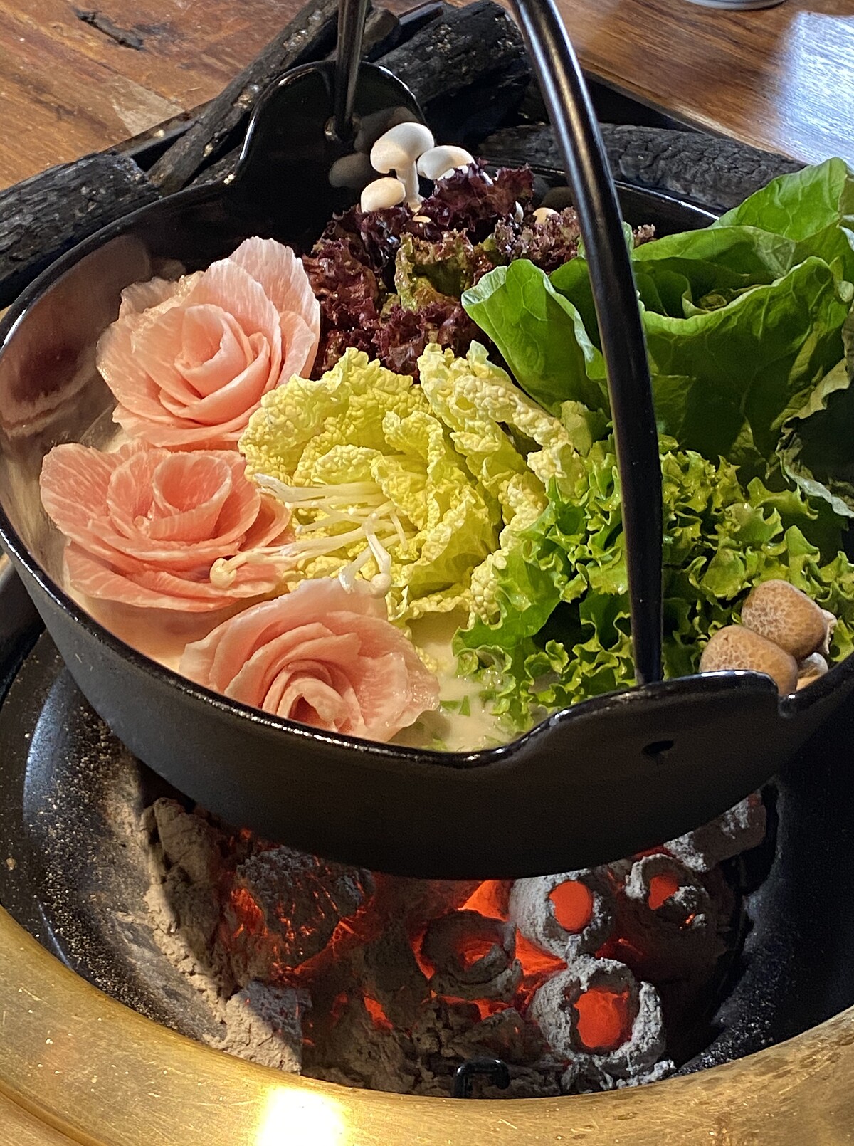 在搭配前菜、刺身、烤物、炸物、雜炊、甜品,以及《寬巷子鍋品》如花藝般的蔬菜、壽司滑、玫瑰松板豬等共12品的無菜單料理,