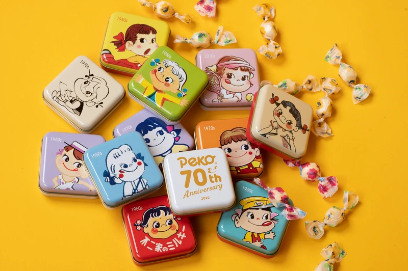 Peko70週年經典牛奶糖小方罐,每一口都帶有濃郁奶香,外盒共12款,復古新設計,同時具收藏價值及收納小物功能,不二家必收!
