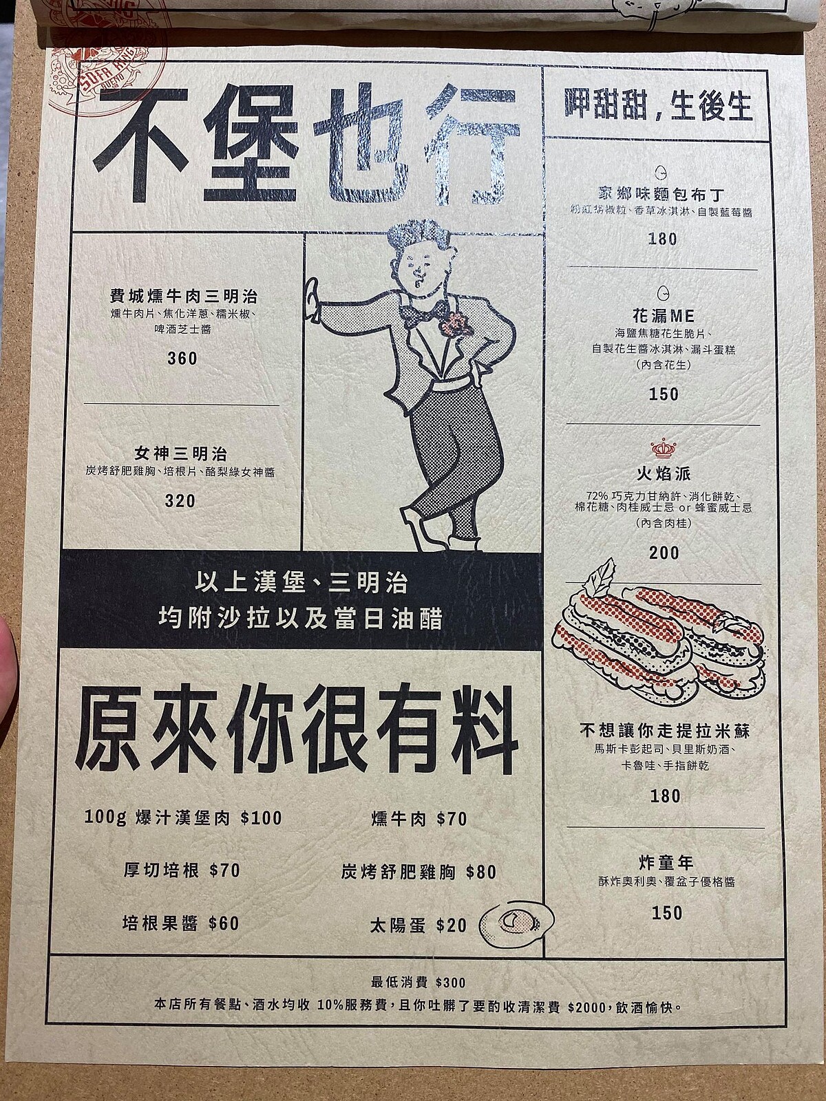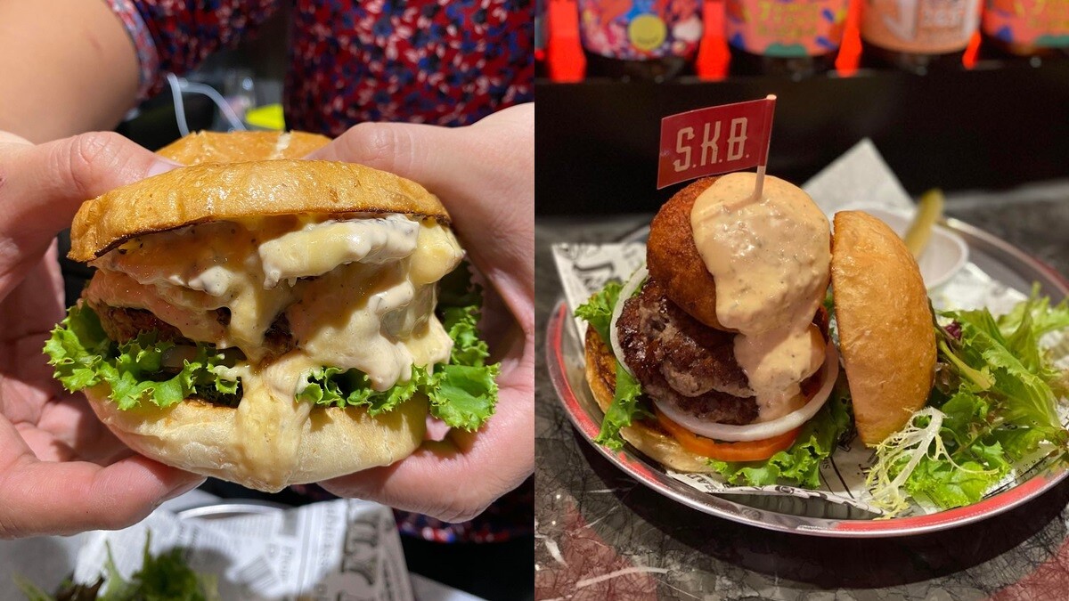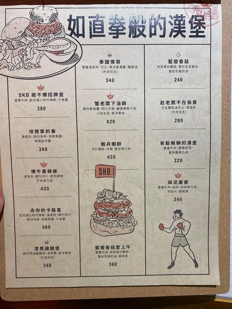 光是漢堡品名就饒富趣味,像是招牌「SKB砸不爛招牌堡」,將漢堡與起司通心粉巧妙結合,特別把起司通心粉製作成日式可樂餅,並融入香濃的啤酒起司醬,再淋上千島醬,展現出漢堡裡所使用的USDA Choice 等級的美國牛肉口感,重點這款要豪邁的壓扁吃,爆汁的狂野吃法,最能滿足味蕾。