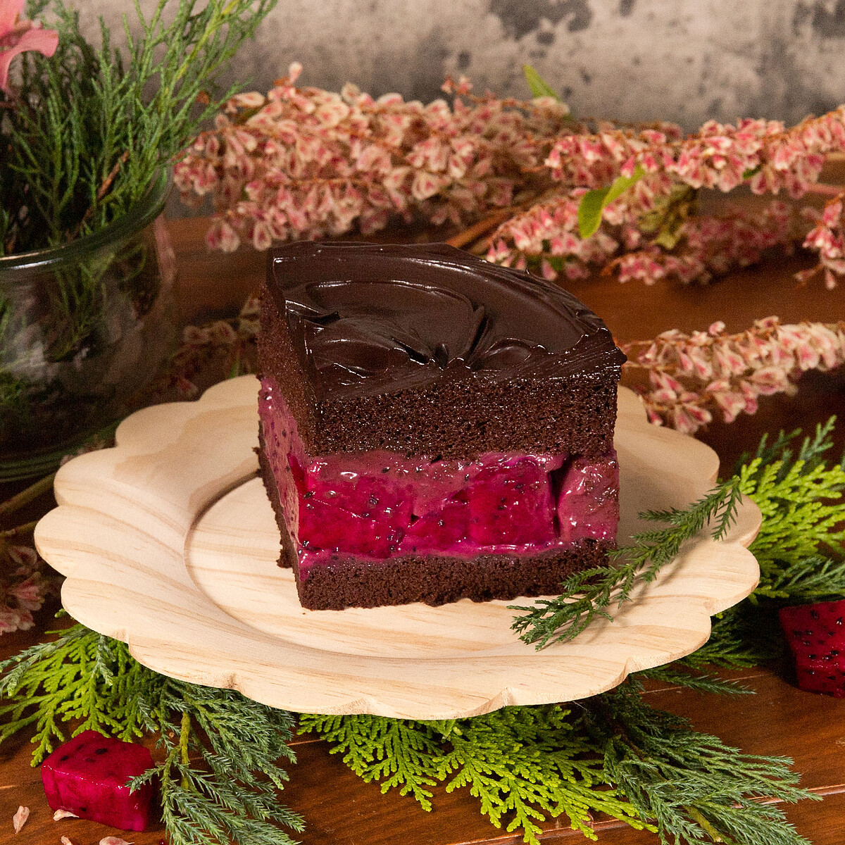 巧克力控必吃!由甜點職人巧手將BAC經典生巧克力餡及鬆軟巧克力戚風結合綜合野莓及新鮮水果,打造的莓果巧克力蛋糕。而野莓慕斯夾餡飽含覆盆子、黑醋栗以及荔枝,將不同水果風味交織出酸酸甜甜新滋味夾餡中更填入大量的火龍果火紅果肉,入口感受微苦甜的巧克力搭配莓果酸甜的口感,無論是生日聚會、家庭聚餐都超適合!
