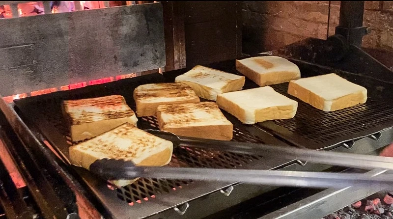 將生吐司厚切28mm經原木柴燒火烤,讓吐司更增添炭火煙燻香氣與微酥口感,讓人食慾大開!
