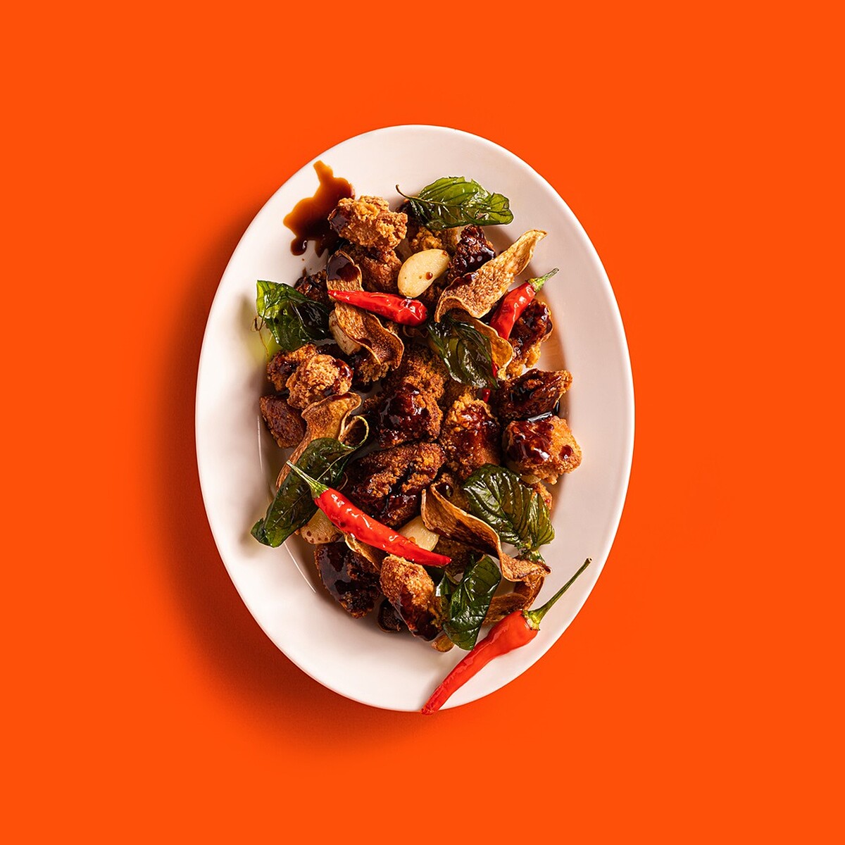 Step4. 放入香香炸雞、辣椒、九層塔拌炒均勻即可