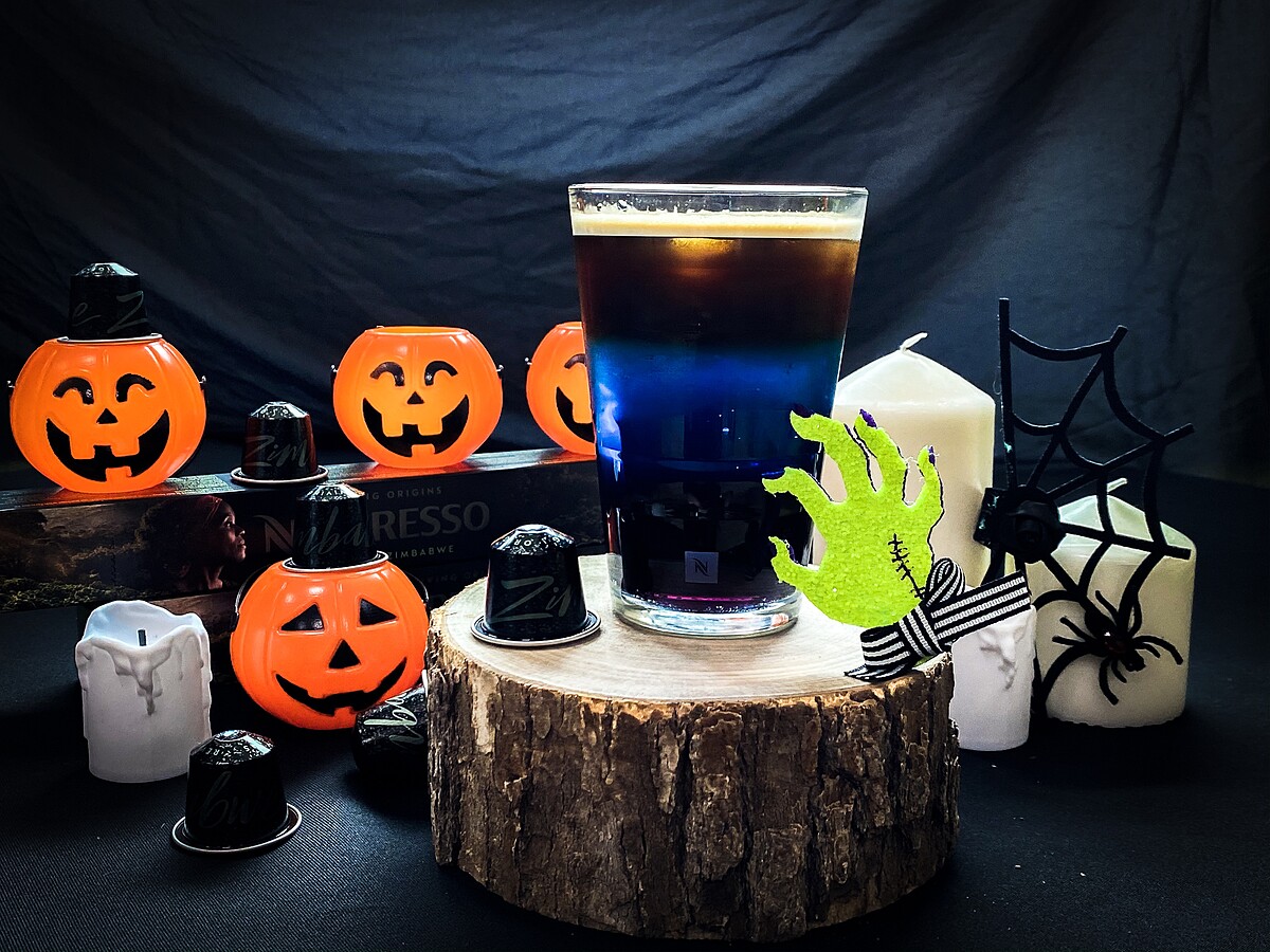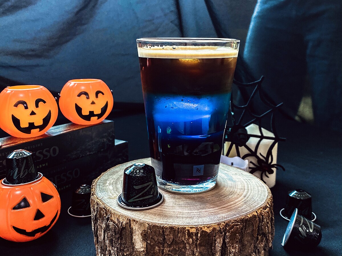 藍色蜘蛛網冰咖啡特調完美呈現出萬聖節神秘又詭譎的氣氛。選用產地復興之旅-辛巴威咖啡,加入莓果糖漿及藍柑橘糖漿後,讓原先帶有馥郁花香與莓果香氣的辛巴威咖啡風味更為強烈!