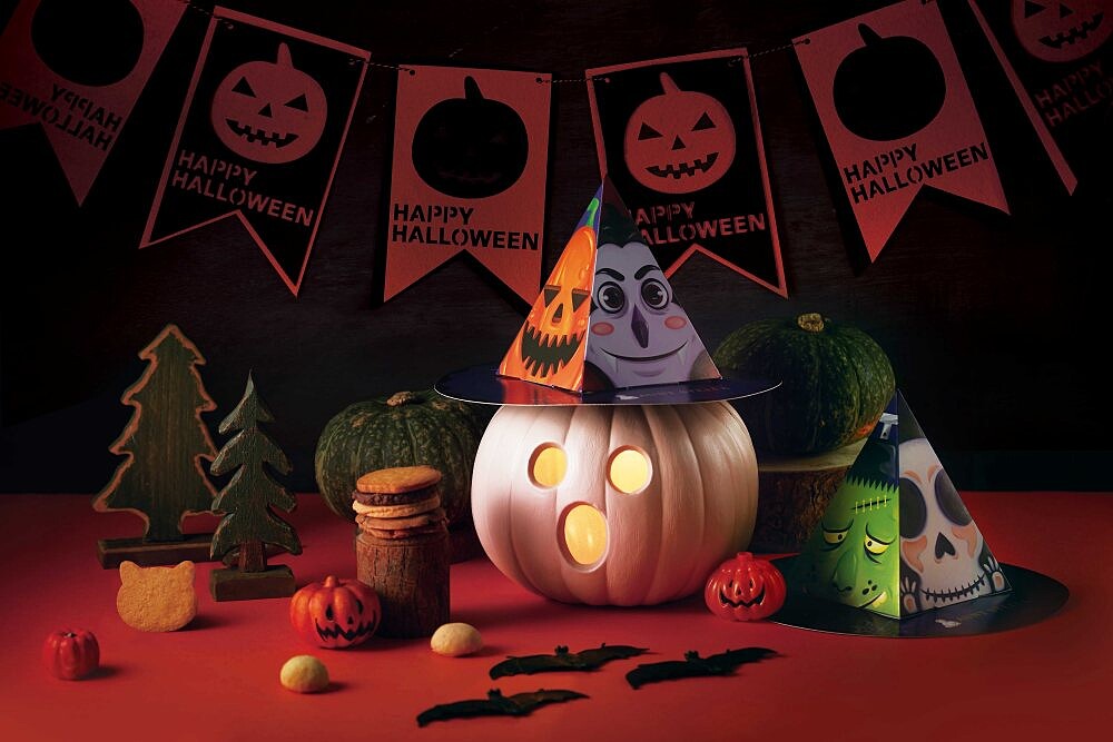 發揮創意巧思結合巫婆帽與餅乾禮盒,將美味手工餅乾取出後,即可戴在頭上成為最亮眼的萬聖節裝扮。充滿童趣又可愛,以搞怪方式呈現四個經典萬聖角色:傑克南瓜燈、吸血鬼、科學怪人、骷髏頭,小朋友戴上餅乾帽,可愛度絕對破錶。